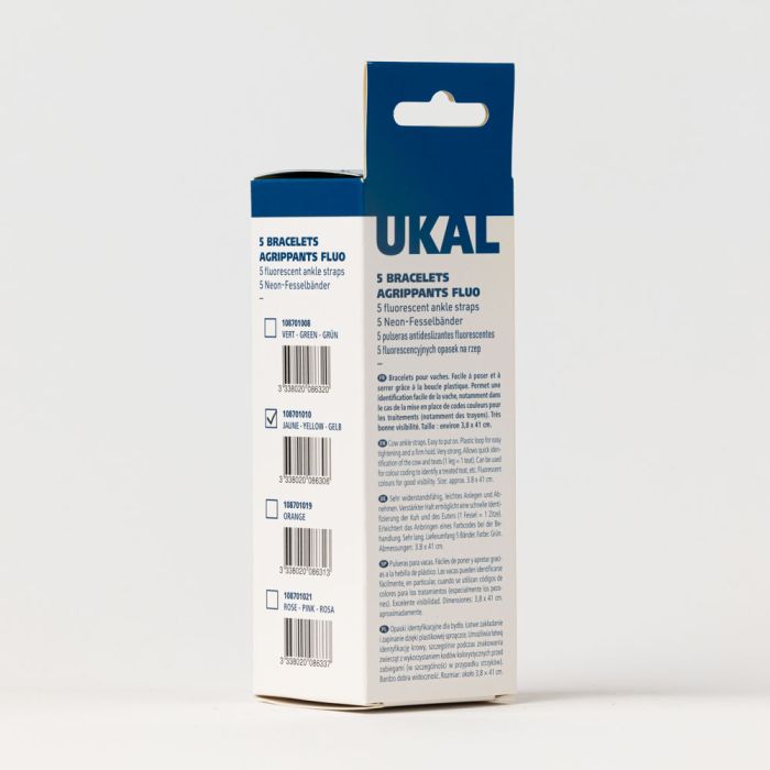 Très résistant, grande facilité de pose et de dépose. Tenue renforcée. Permet une identification rapide de la vache et du pis (1 patte = 1 trayon). Facilite la mise en place d'un code couleur dans le cas de traitement. Grande longueur. Vendu par 5. Couleur: Jaune.