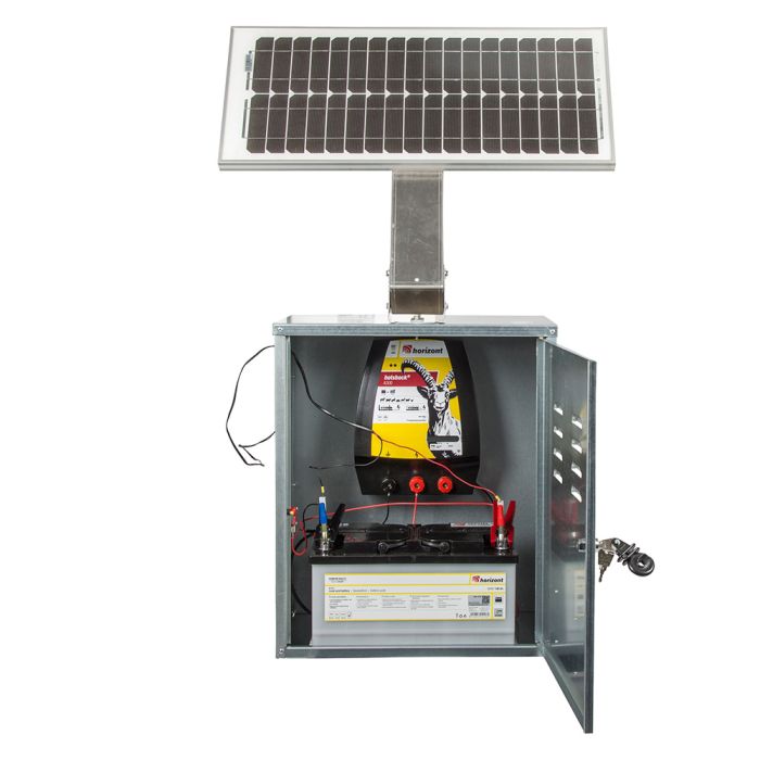 Cette boîte de sécurité verrouillable et électrifiable offre une bonne protection contre le vol. Si une personne non autorisée touche la boîte, il reçoit une décharge électrique désagréable et dissuasive. Seul le propriétaire peut ouvrir la boîte avec une clé isolée et utiliser l’appareil de clôture électrique s’y trouvant. Cette boîte métallique verrouillable est recommandée pour tous les accumulateurs 12V des séries «horiSMART, farmer, hotSHOCK et ranger». Pour les batteries 12 V jusqu'à 100 Ah. Lors de l’ouverture de la porte, le passage de courant est interrompu permettant ainsi un travail sans risque dans la boîte. Lors de la fermeture de la boîte, le courant est rétabli automatiquement. Interrupteur marche / arrêt.