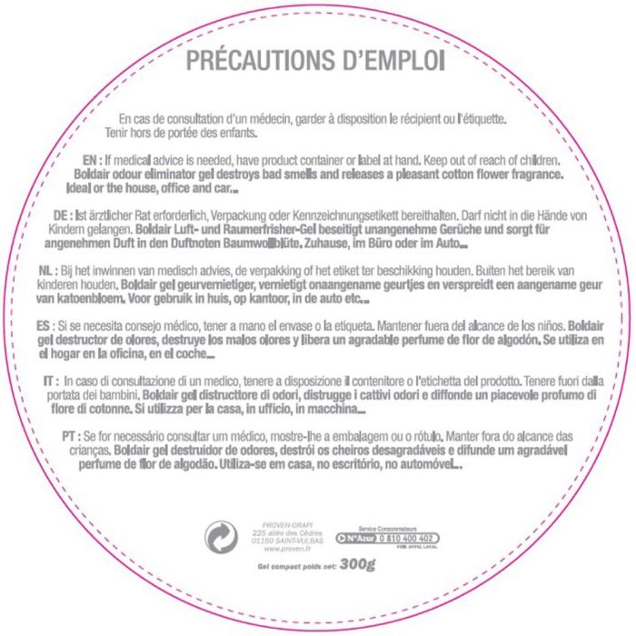Retirez le couvercle du gel BOLDAIR destructeur d'odeurs. Placez-le à proximité de la source des mauvaises odeurs et laissez agir. Le gel est efficace pour une surface de 30 m². Pour des espaces plus grands, utilisez plusieurs pots pour une efficacité optimale.