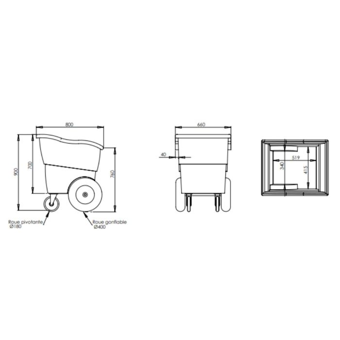 - Roues arrière : 2 fixes gonflables Ø 400 mm