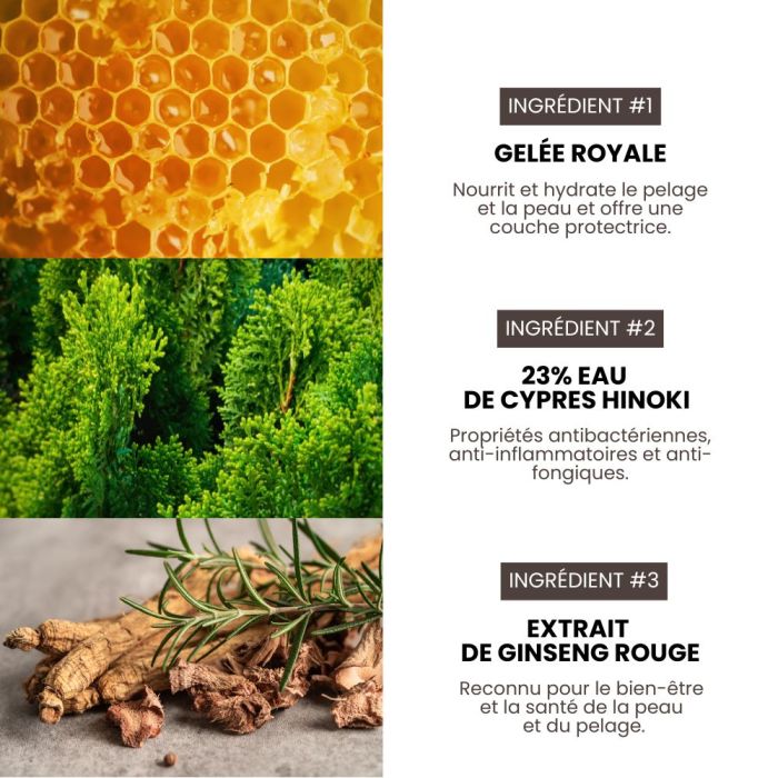 Ce spray est formulé avec 23 % d'extrait de cyprès, qui possède des propriétés antibactériennes, anti-inflammatoires et antifongiques naturelles, sans tensioactif. Les extraits de ginseng rouge et de gelée royale apaisent, réparent et hydratent profondément le pelage, renforçant ainsi sa texture.