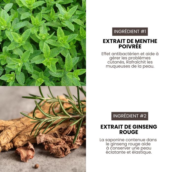 Cet après-shampoing contient de l'extrait de menthe pour rafraîchir les muqueuses de la peau, offrir un effet antibactérien et aider à traiter les problèmes cutanés. En parallèle, la saponine présente dans le ginseng rouge contribue à maintenir une peau éclatante et élastique.