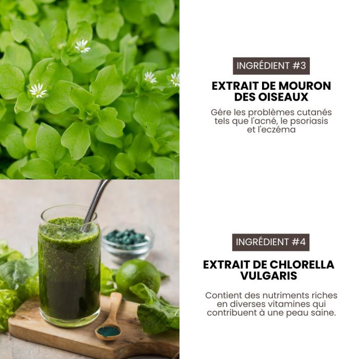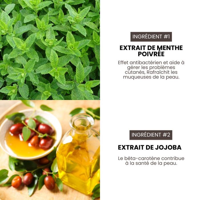 Ce shampoing est formulé avec de l'extrait de menthe, qui rafraîchit les muqueuses de la peau, a un effet antibactérien et aide à traiter les problèmes cutanés. Le bêta-carotène de l'extrait de jojoba contribue à la santé de la peau. L'extrait de mouron des oiseaux est particulièrement utile pour traiter des problèmes cutanés tels que l'acné, le psoriasis et l'eczéma. L'extrait de Chlorella Vulgaris contient des nutriments riches en vitamines, favorisant ainsi une peau saine.