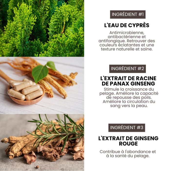Les ingrédients d’exception qui composent ce shampoing agissent en synergie pour nourrir et revitaliser le pelage. L’eau de cyprès, aux propriétés antimicrobiennes et purifiantes, ravive la couleur et protège la fibre capillaire. L’extrait de racine de Panax ginseng stimule la pousse et renforce le poil, tandis que le ginseng rouge aide à préserver la densité et à réduire la chute des poils. Les huiles naturelles de jojoba, de camélia et d’argan complètent cette formule en apportant douceur, hydratation et souplesse.