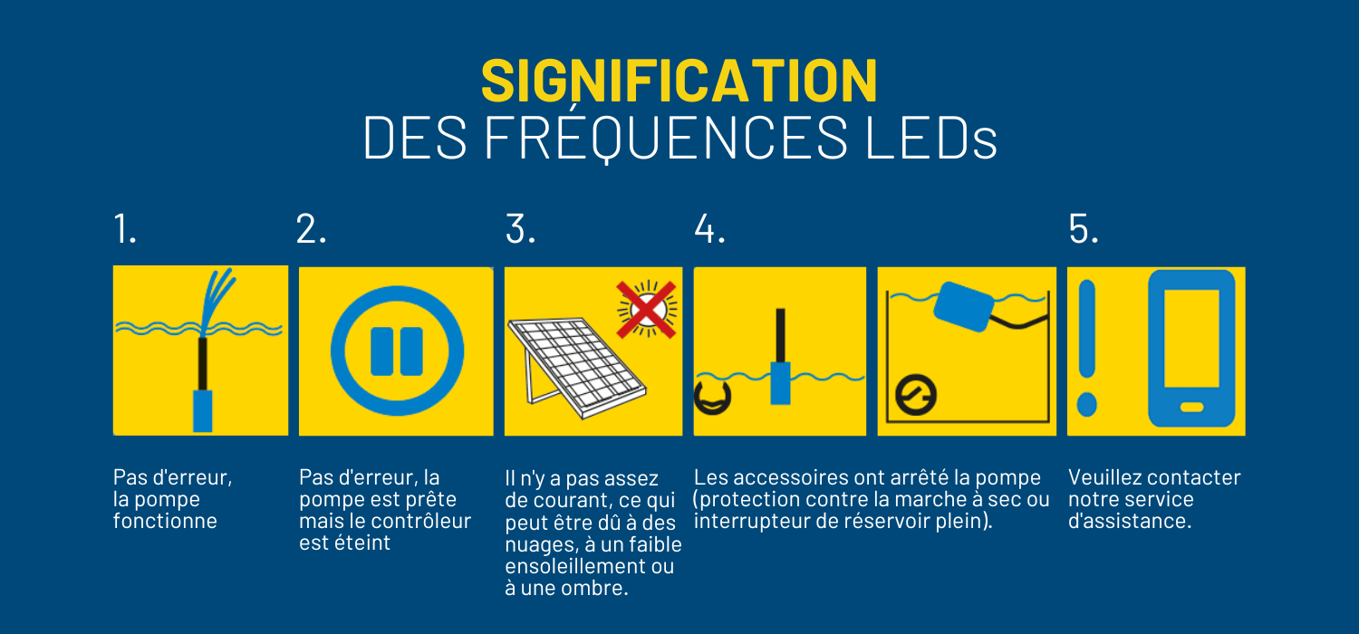 La pompe LORENTZ S1-200 est munie de 6 niveaux de LED sur votre contrôleur pour vous guider sur son état de fonctionnement.