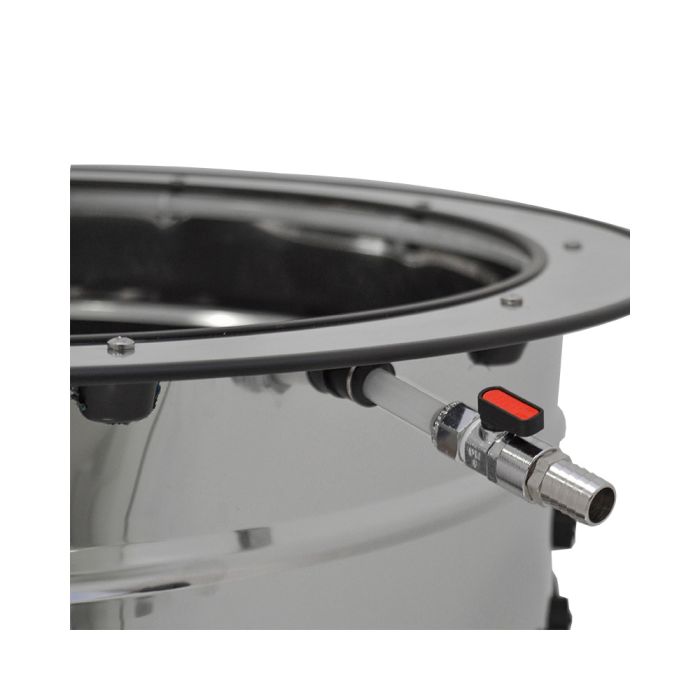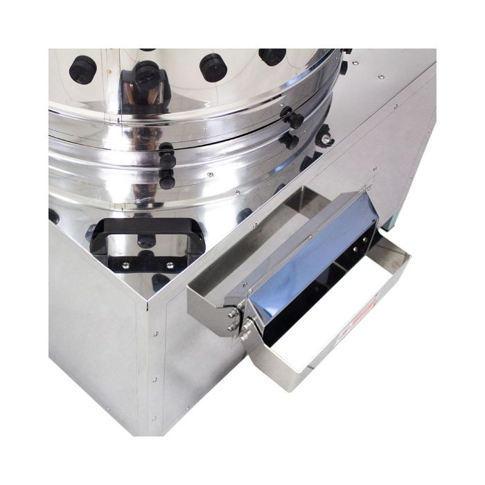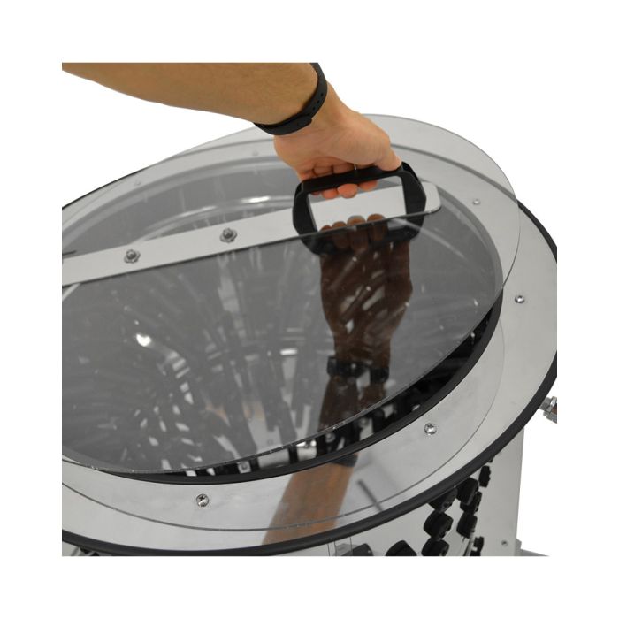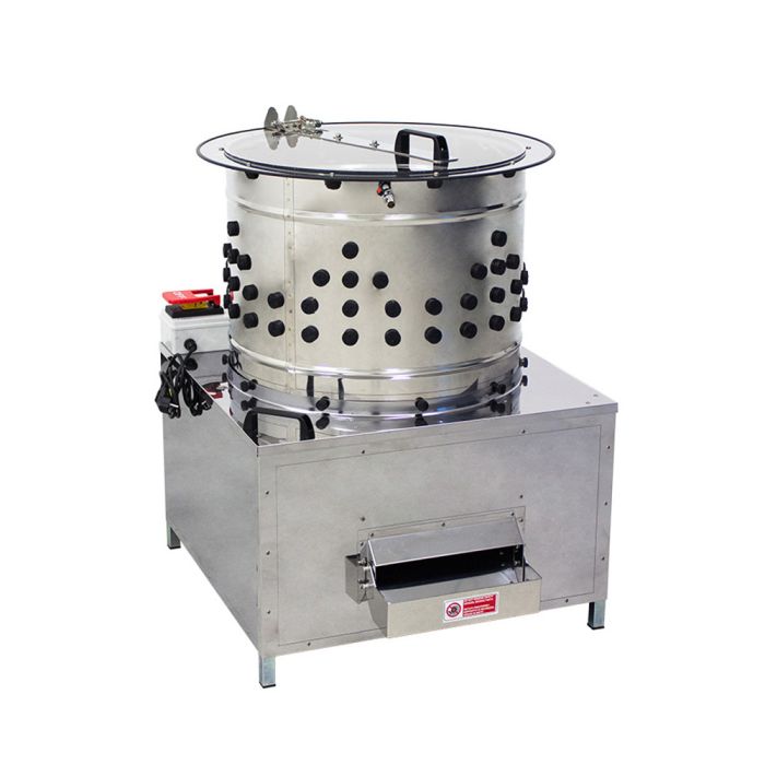 Après avoir trempé l’animal dans l’eau chaude, ce qui permet une plumaison facile et sans dommage de la peau, mettez-le dans le cylindre de la plumeuse et fermez le couvercle. Le plateau rotatif fait tourner l’animal : le contact répété avec les doigts en caoutchouc permet d’obtenir une plumaison rapide et efficace sans abimer la peau. Les plumes sont évacuées de la machine grâce à un système de lavage à eau. La plumeuse possède une entrée et un robinet pour le lavage à l'eau qui servira à évacuer les plumes.