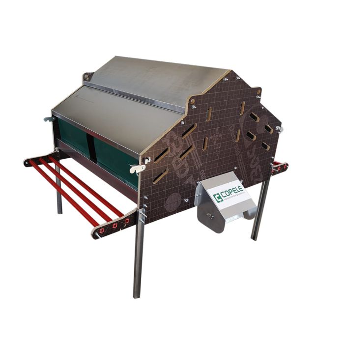 Pondoir collectif de la marque Copele pour environ 120 poules pondeuses. Ce pondoir est équipé d’un tapis roulant central permettant de récupérer les œufs en l’actionnant à l’aide d’une manivelle. Ce système ingénieux permet de les récupérer rapidement sans les abimer.
