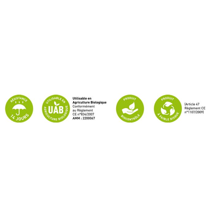 • Formulation résistante à la pluie jusqu’à 14 jours.