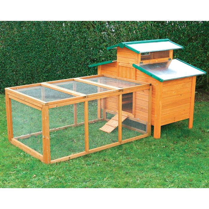 Ce poulailler dispose de 2 aérations grillagées sur le haut du toit. La toiture, en métal galvanisé, assure à la fois étanchéité et durabilité.