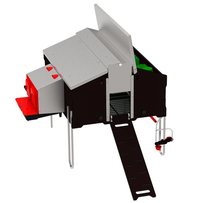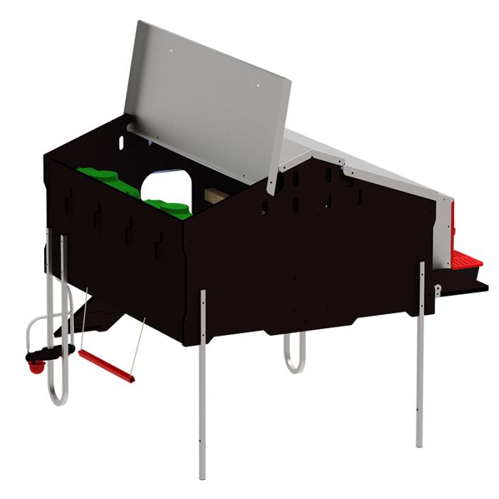 Le toit se soulève permettant ainsi de visualiser l'intérieur du poulailler ou d'y accéder pour le nettoyer.