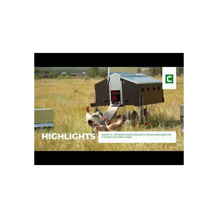 Il est également équipé de deux réservoirs d'une capacité de 7 litres chacun reliés à deux abreuvoirs basculants montés sur le pied du poulailler.