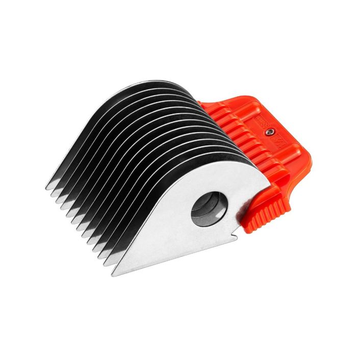Le sabot snap - on est fabriqué en acier inoxydable, grâce à sa conception robuste, il offre un glissement fluide à travers tous les types de pelage, garantissant une bonne expérience de tonte et s'adapte aux tondeuses de finition Heiniger. Les dents lisses et arrondies du surpeigne permettent de maintenir une longueur de coupe de 38mm, assurant un résultat de qualité professionnelle.