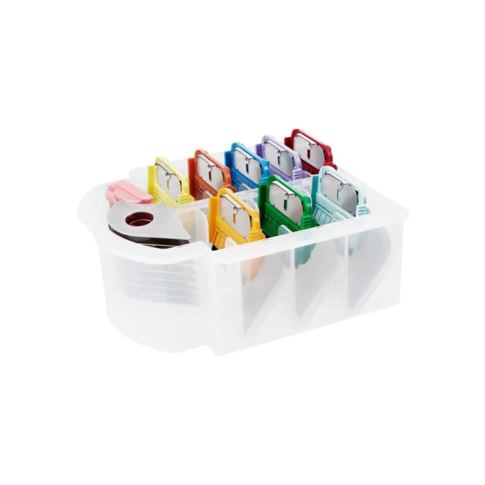 Le kit 9 sabots s’adapte sur l’ensemble des têtes de coupe Saphir (hors tête de coupe SAPHIR – W) pour les tondeuses de finition Heiniger. Chaque sur-peigne est doté de dents lisses et arrondies en acier inoxydable, parfaitement ajustées pour offrir une coupe sûre et précise lors du toilettage. Ces sabots permettent un glissement fluide pour tous types de pelage. La longueur de coupe est comprise entre 3 et 32 mm. Chaque sabot dispose d’une couleur universelle permettant une identification rapide des différentes tailles.